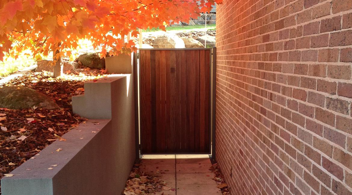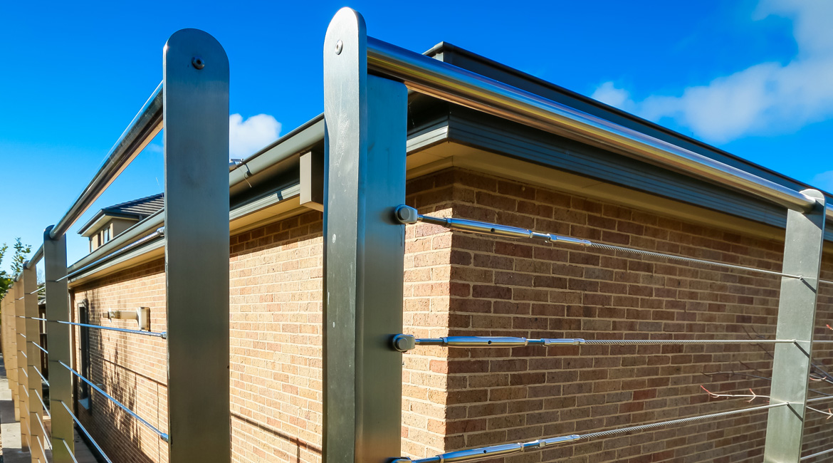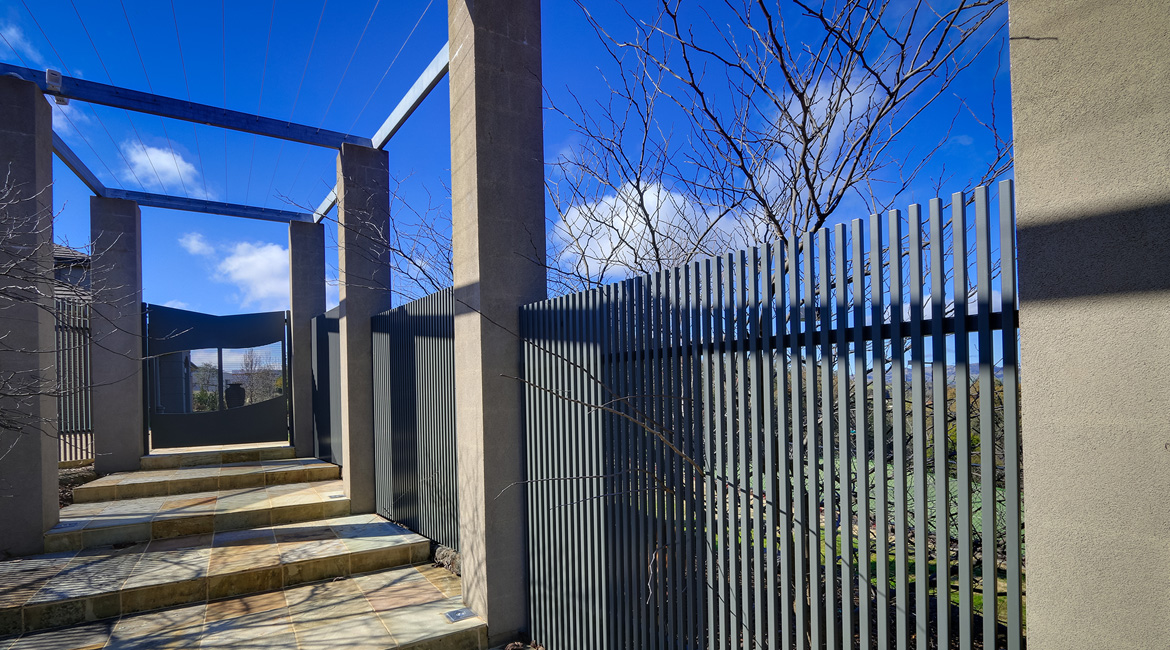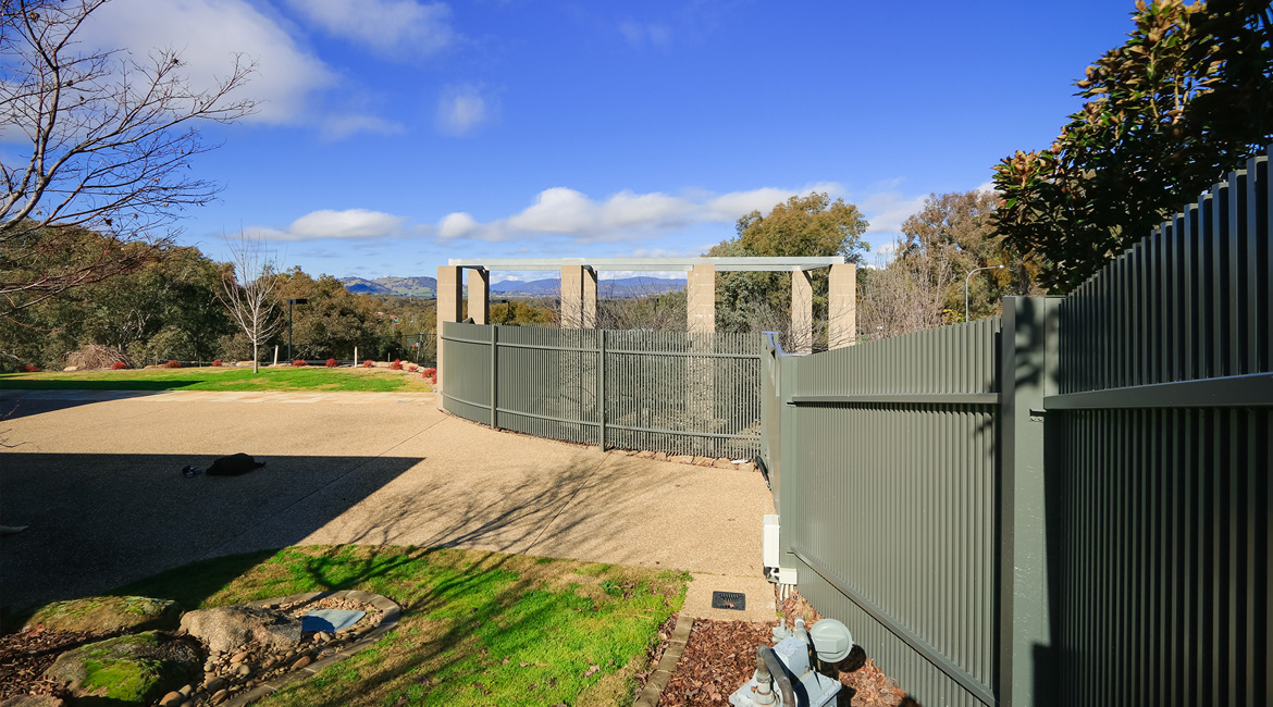 One of this family’s needs was for a cost-effective solution to block the view from the road that runs directly around the back of their house above them. They found that the cost of an acoustic wall was nearly a quarter of the price of a brick wall which suited their budget. Along with this, people from the road could see straight into their pool area. We were able to provide a 2.4m high acoustic wall that gave them privacy that exceeded their expectations. We were also able to provide them with custom-made galvanised steel powder-coated picket fencing in both curved and raked configurations and architecturally designed one-off electric swing gates. We also supplied and installed Stainless steel wire balustrading, glass pool fencing, aluminium flat top pool fencing, custom-made merbau slat timber and powder-coated galvanised steel-framed gates, rural kopper log and aviary mesh fencing and a custom-made steel rim around their pond water feature.